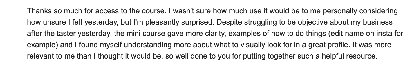 This mini-course is all is about making it easier to understand, easier to trust and easier to book from. It shows you how to tighten the parts of your Facebook or Instagram page that are quietly losing you business, so that when someone lands there, they do not have to piece things together for themselves. They know what you do, who you help, why they should trust you and what to do next.